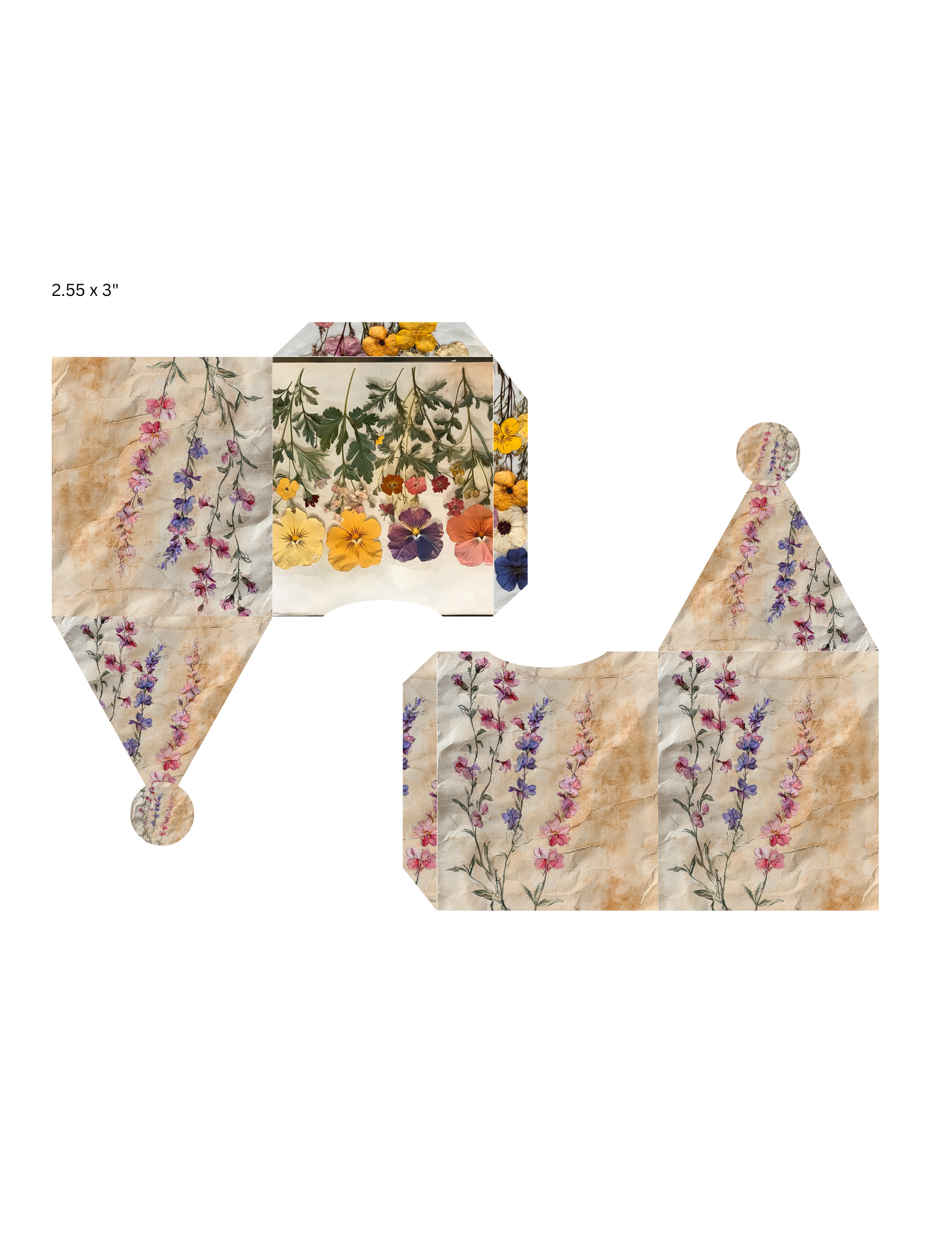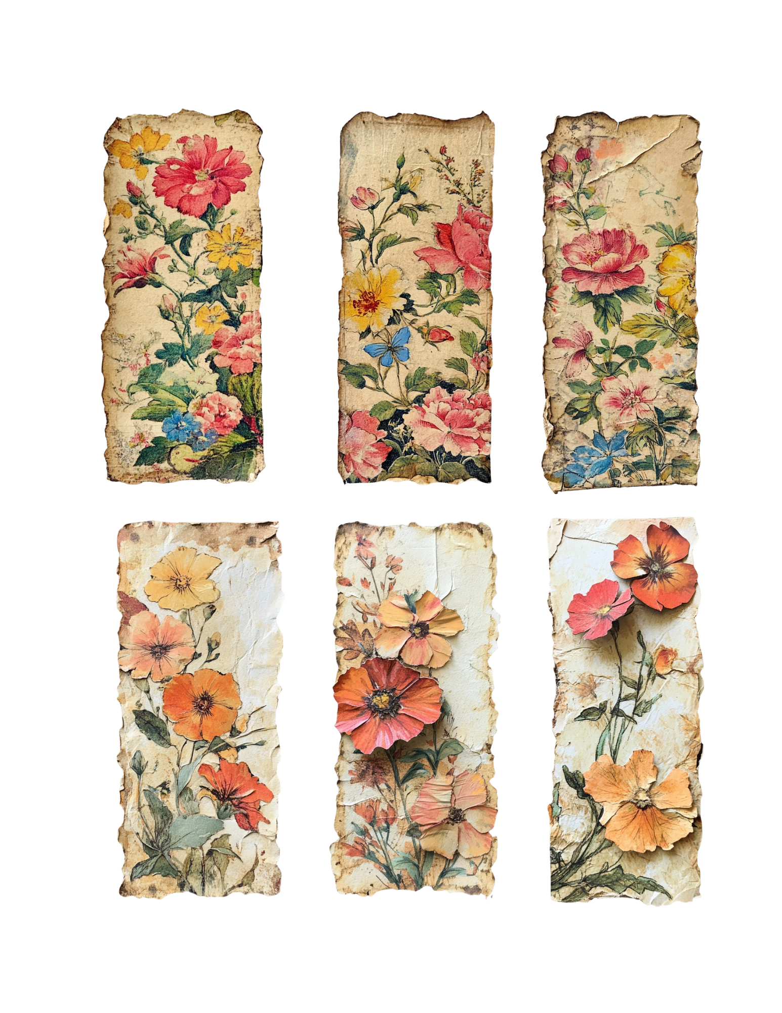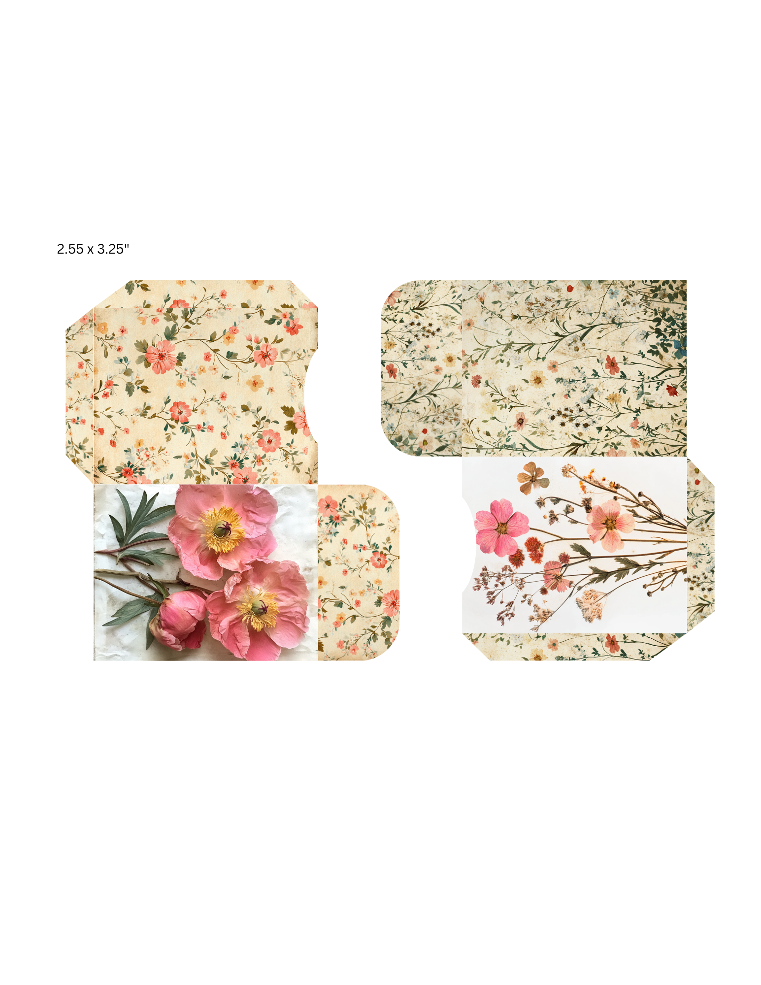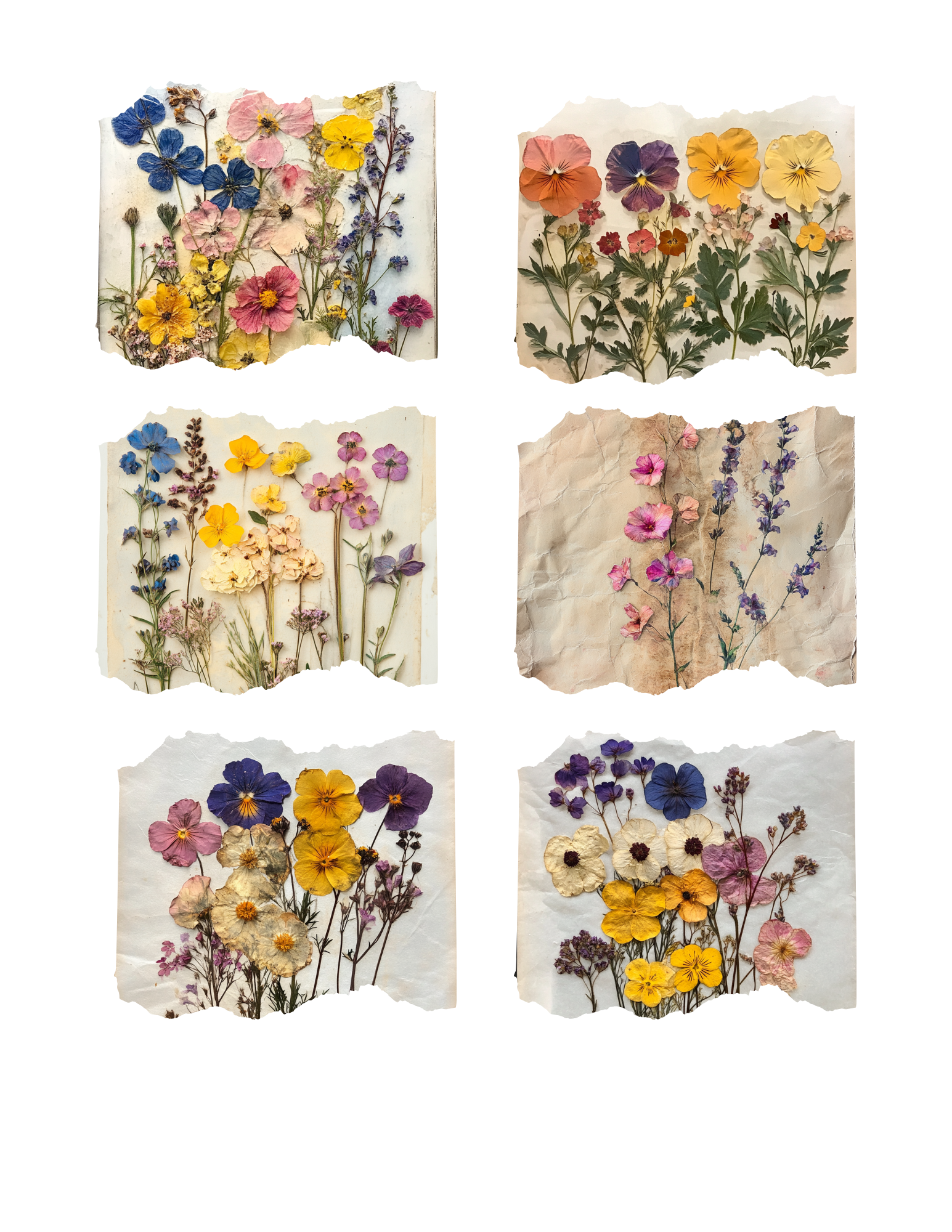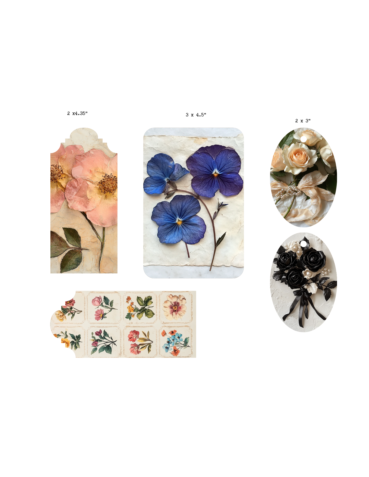 Pressed blooms, faded bouquets, torn paper edges, postage stamps, and more — perfect for layering and collaging.